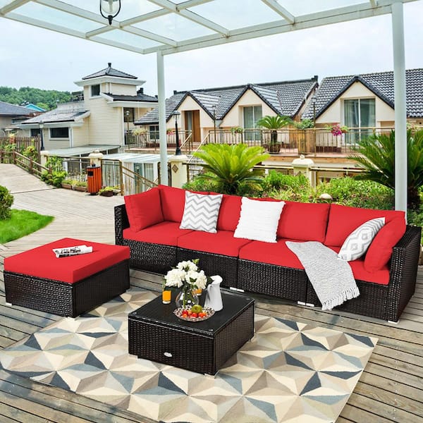 Brown 6-Pieces Wicker Outdoor Sectional Set with Red Cushions