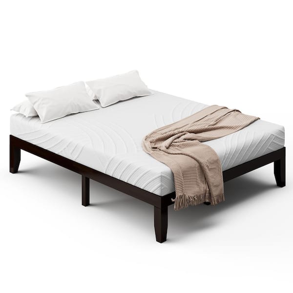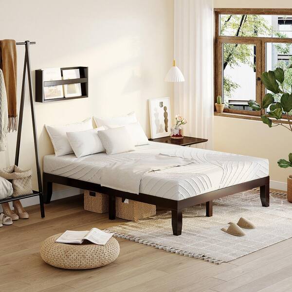 Brown Wood Bed Frame Queen Platform Bed with 8 in. Foam Mattress Set CertiPUR-US Certified