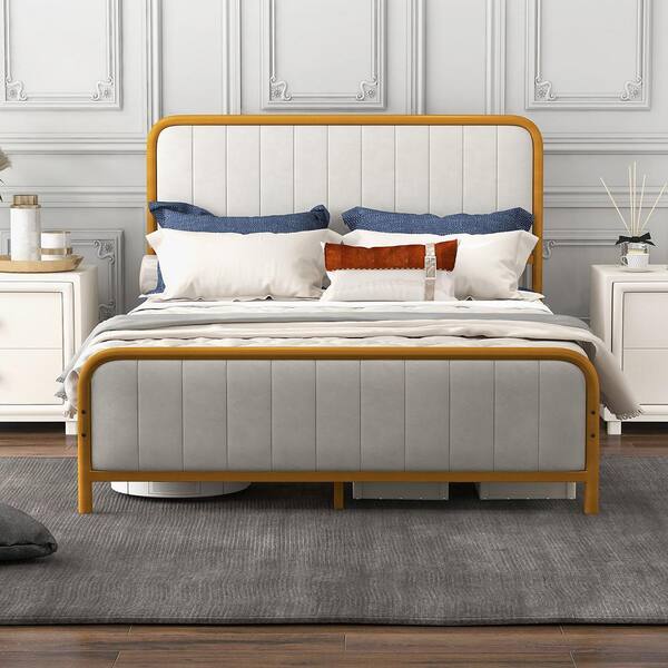 Gold Metal Bed Frame Upholstered Queen Platform Bed with Velvet Headboard