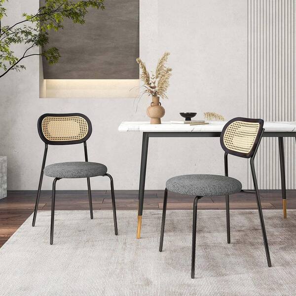 Gray Rattan Dining Chair Set of 2-Upholstered Mesh Cane Backrest Linen Fabric Kitchen