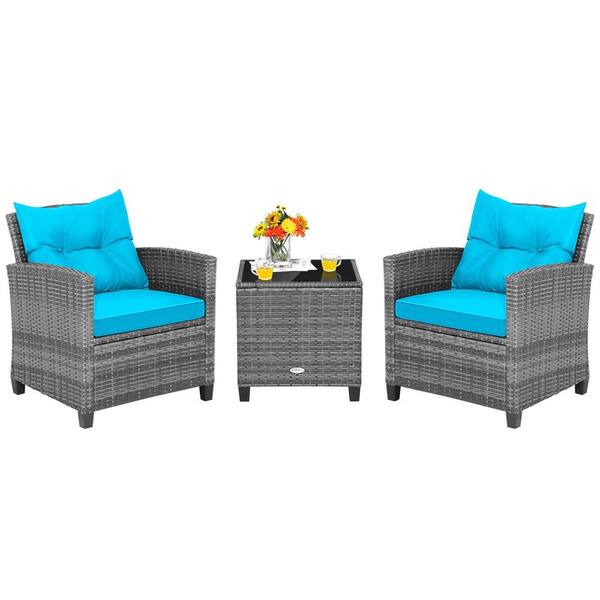 Grey 3-Piece Metal Patio Conversation Set with Turquoise Seat Cushions and Back Cushions