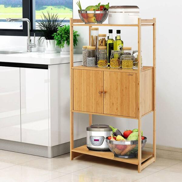 Natural Bamboo Bathroom Cabinet Freestanding Tall Storage Shelf Unit with 2 Doors and Shelves