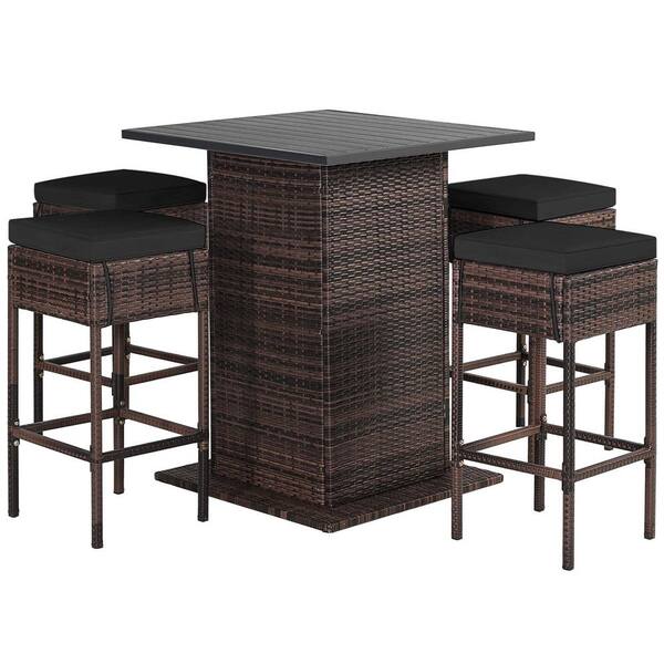 Patio Plastic Wicker Outdoor Bar Stool Set with Black Cushions Hidden Storage Shelf