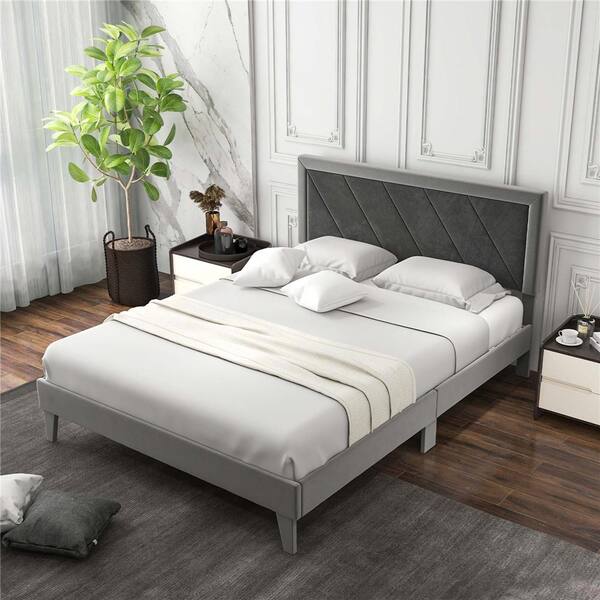 Queen Size Bed Frame Upholstered Platform Velvet Headboard Wooden Slats Gray