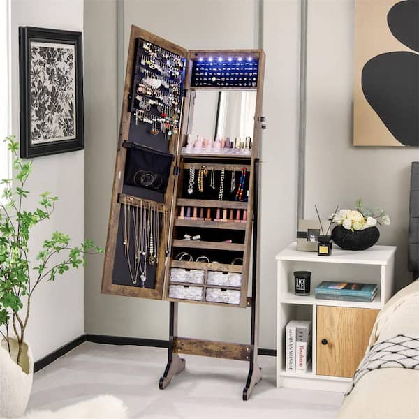 Rustic Brown MDF Jewelry Cabinet Armoire Full Length Frameless Mirror Lockable with Lights