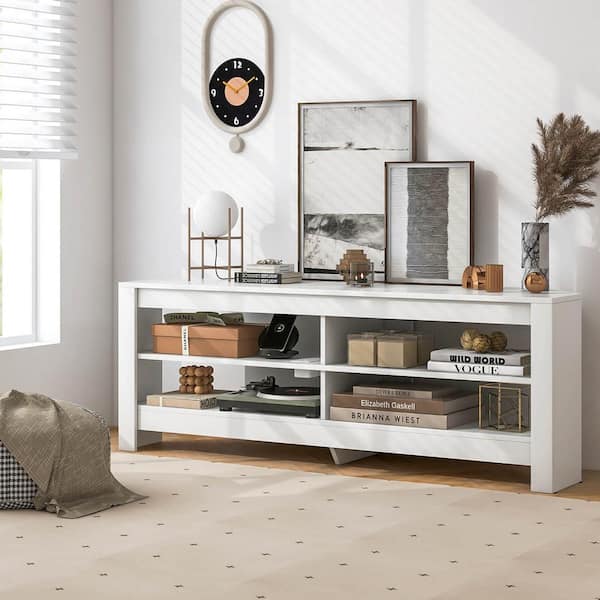 White TV Stand Fits for TVs up to 65 in. with Power Outlet and 4 Open Storage Shelves for Living Room