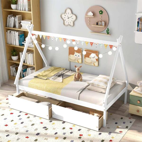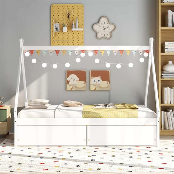 White Twin Size Wooden House Bed Frame with 2 Drawers Roof Storage for Boys and Girls