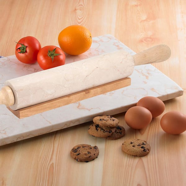 Deluxe 18 in. Champagne Marble Rolling Pin with Wood Handles and Cradle