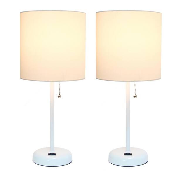 19.5 in. Contemporary Bedside Duo, White Table Lamp 2-Pack Set with Power Outlet, White Shades