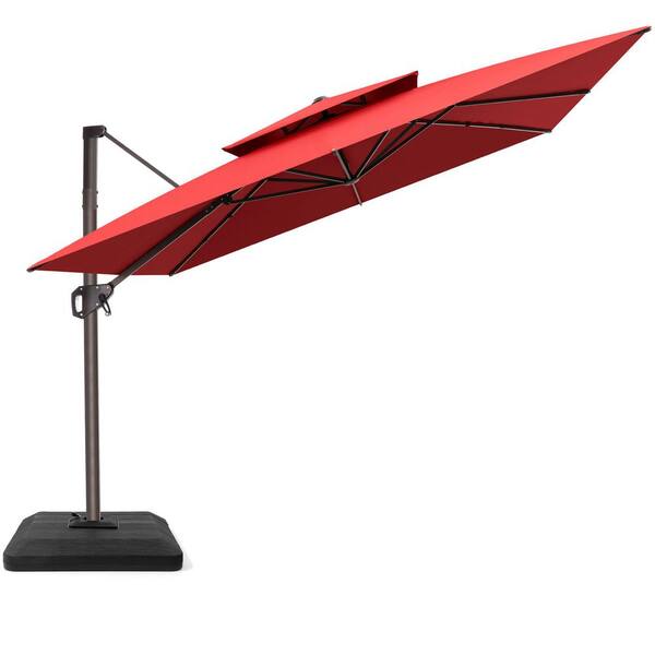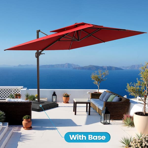 10 ft. Square Double-Top Polyester Cantilever Tilt Patio Umbrella in Red with 220 lbs. HDPE Base