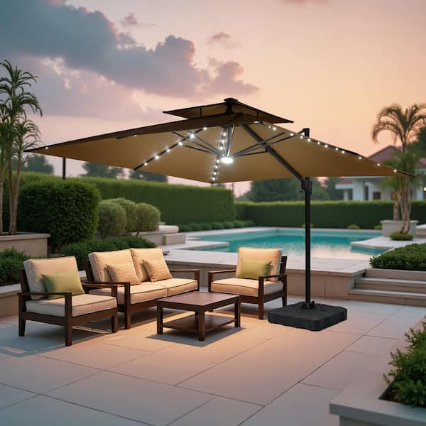 11 ft. x 11 ft. LED Square Swivel Double Top Cantilever Tilt Patio Umbrella in Tan with 260 lbs. HDPE Base