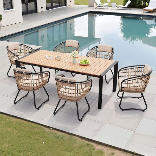 7-Piece Metal 83.86 in. Outdoor Dining Set with Rattan Chairs and Beige Cushions