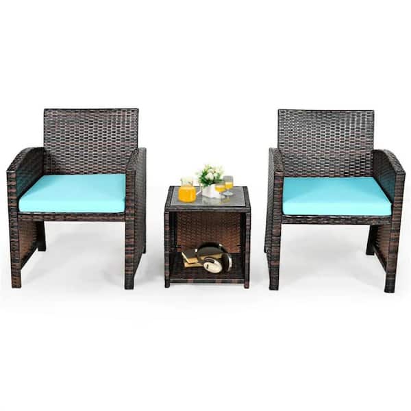 Blue 3-Piece Wicker Outdoor Lounge Chair without Sunshade with Blue Cushion