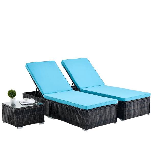 Brown 1 Piece Wicker Outdoor Chaise Lounge Chair Without Sunshade with Blue Cushion