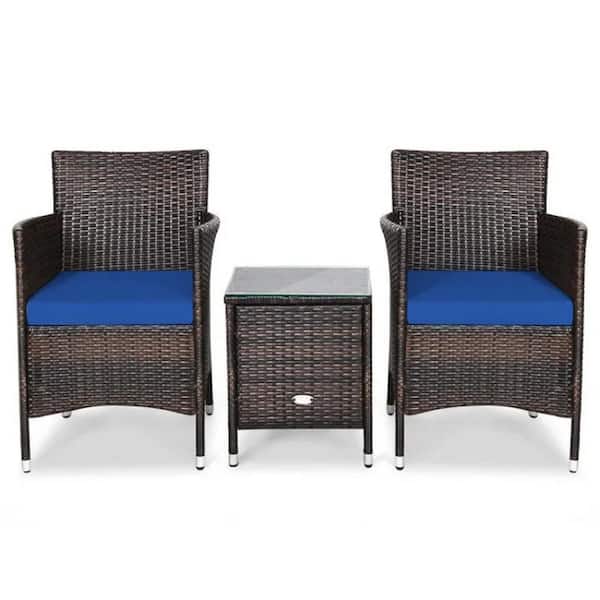 Brown 3 Piece Wicker Outdoor Lounge Chair Without Sunshade with Navy Blue Cushion