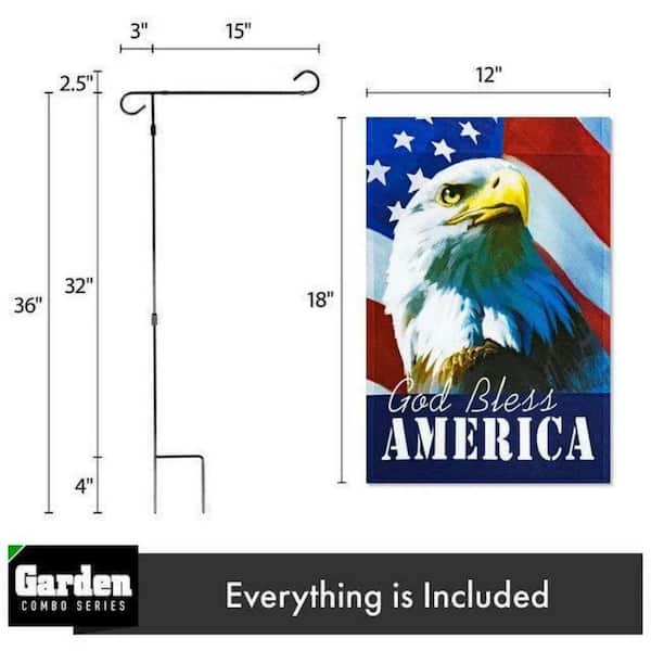 Combo Pack Garden Flag Stand Black 36x16 in. and Garden Flag God Bless America USA Flag with Eagle 12x18 in.
