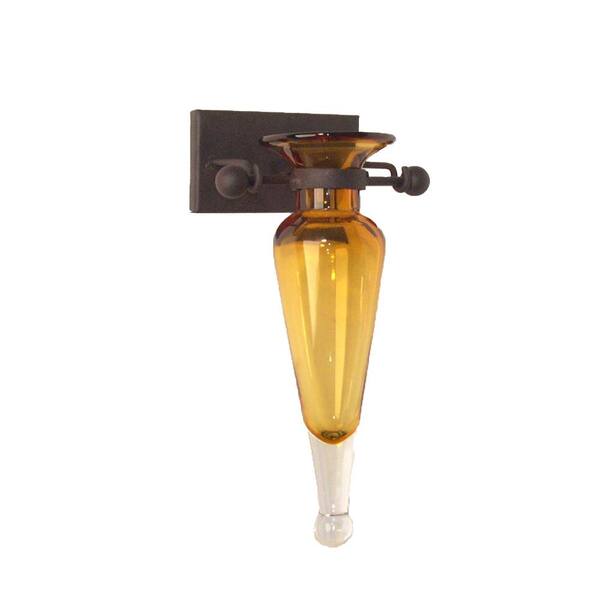 13 in. Glass Wall Mount Decorative Amphora Vase on Iron Sconce with Finials in Amber Glass