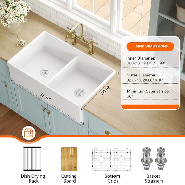 33 in. Fireclay Double Bowl Farmhouse Apron Undermount Workstation Kitchen Sink in White with Accessories