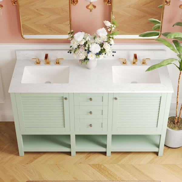 60 in. Double Sink Freestanding Light Green Wood Bath Vanity with White Engineered Marble Top (Assembled)