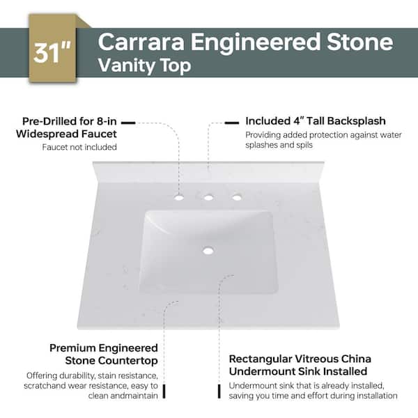 31 in. W. x 22 in. D Engineered Stone Composite White Rectangular Single Sink Bathroom Vanity Top in Carrara White