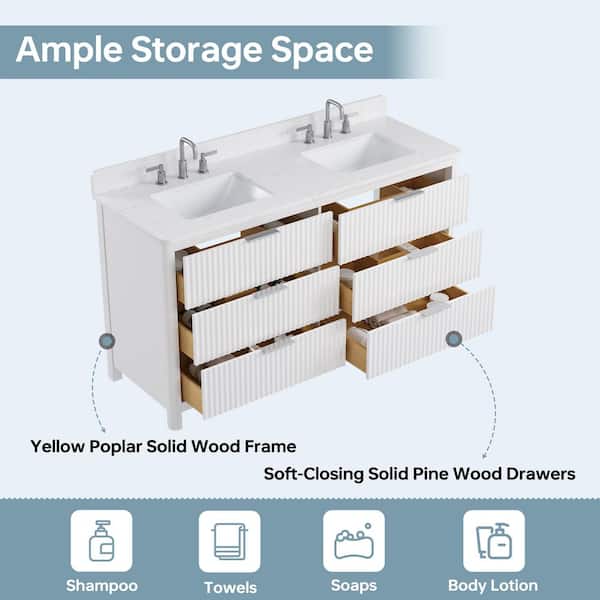 Gwen 61 in. Double Sink Freestanding White Bath Vanity with Carrara White Engineered Stone Top and Backsplash Assembled