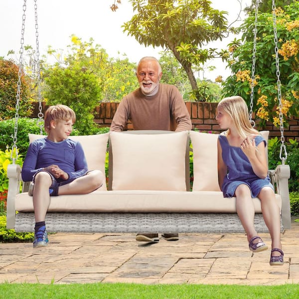 3-Person Gray Wicker Porch Swing with Khaki Cushions, Reinforced Metal Back