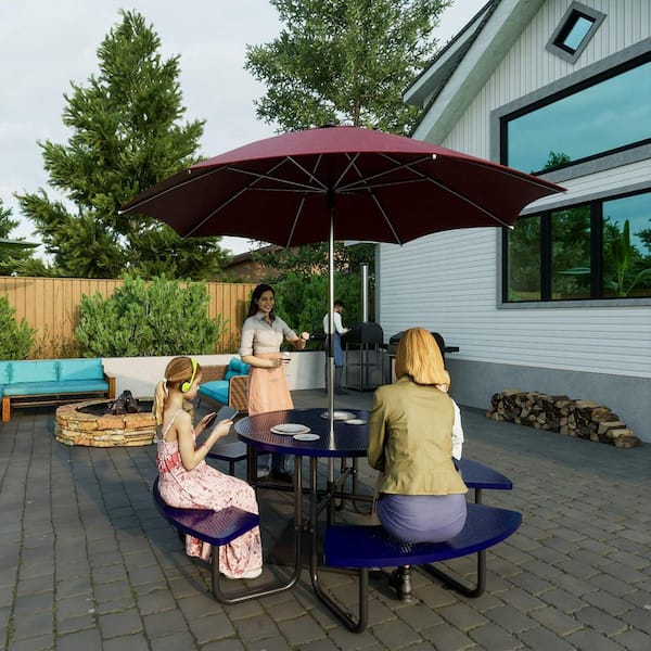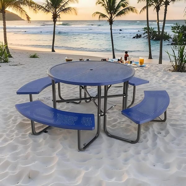 46 in. Blue Round Outdoor Carbon Steel Picnic Table Seats 8 People with Umbrella Hole