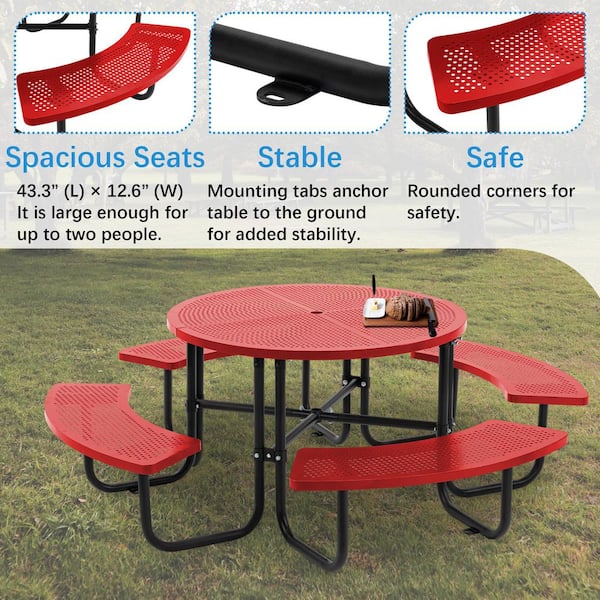 46 in. Red Round Galvanized Steel Picnic Table Seating up to 8 People with Umbrella Hole