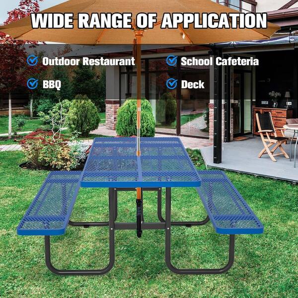 72.2 in. Blue Rectangular Outdoor Steel Picnic Table with Umbrella Hole and 2 Built-in Benches