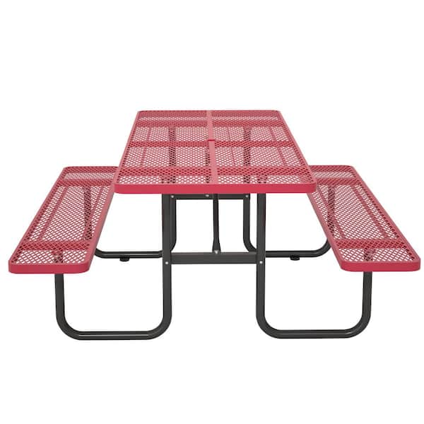 72.2 in. Red Rectangular Outdoor Steel Picnic Table with Umbrella Hole and 2 Built-in Benches