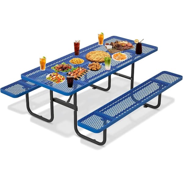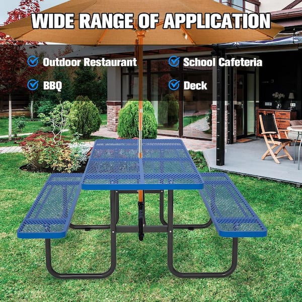 72 in. Blue Outdoor Carbon Steel Picnic Table Seats 6 People with Umbrella Hole