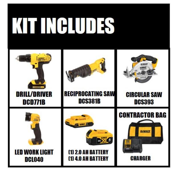 • Includes 20V drill/driver, circular saw, and reciprocating saw