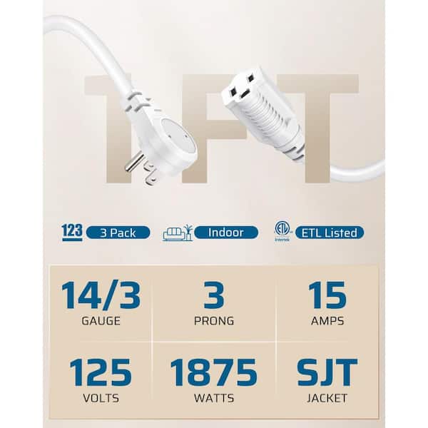 1 ft. SJT 14/3 Indoor Extension Cord with 3-Prong Outlets and SPT-3 Cord, 3 Pack, White