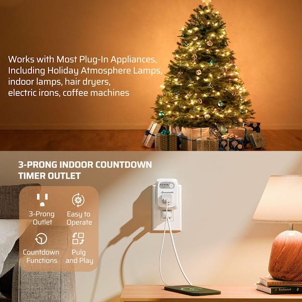 15A 125V 15/30/45/60min Indoor Countdown Timer Outlet for Steam Iron, Curling Iron with Grounded, 3 Prong-White 2 Pack