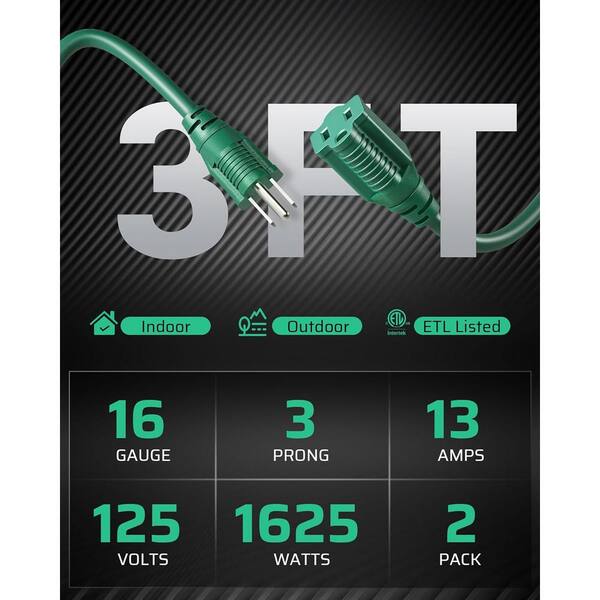 2-Pack 3 ft. 16/3 SJTW Indoor/Outdoor Extension Cord with 3 Prong Extension Cord for Lighting, Green