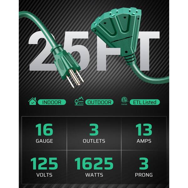 25 ft. 16/3 SJTW Indoor/Outdoor Tri-Tap Extension Cord for Holiday Decoration and Landscaping Lights, Green (2-Pack)
