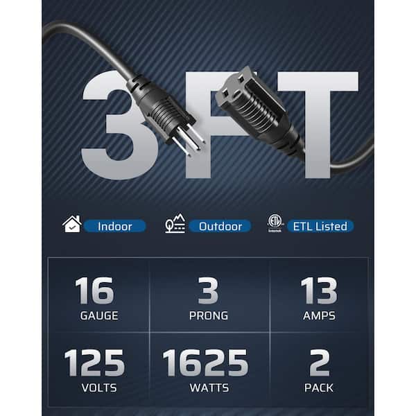 3 ft. 16/3 Heavy Duty SJTW Indoor/Outdoor Extension Cord, 2 Pack, Black