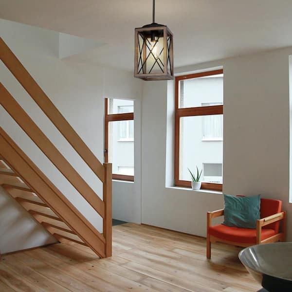 60-Watt 1-Light Farmhouse Pendant Light with Brown Wooden Grain Finish Shade, No Bulbs Included