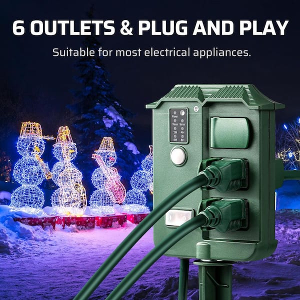 Outdoor Dusk to Dawn Power Stake Timer, Waterproof 6 Grounded Outlets, 6 ft. Cord, for Christmas Decoration Lights