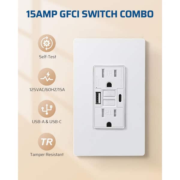 White 15 amp Tamper Resistant GFCI Duplex Outlet with USB-A, USB-C charger