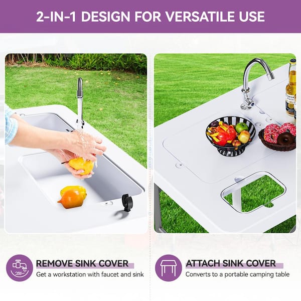 2-in-One 40 in. Portable Folding Fish Cleaning Patio Dining Table with Deep Sink, Water Hose Hookup and Fauce