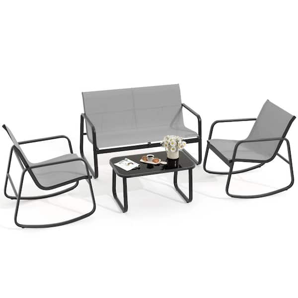 4-Piece Patio Outdoor Furniture Bistro Set with 1 Loveseat 2 Rocking Bistro Chairs and Glass Table