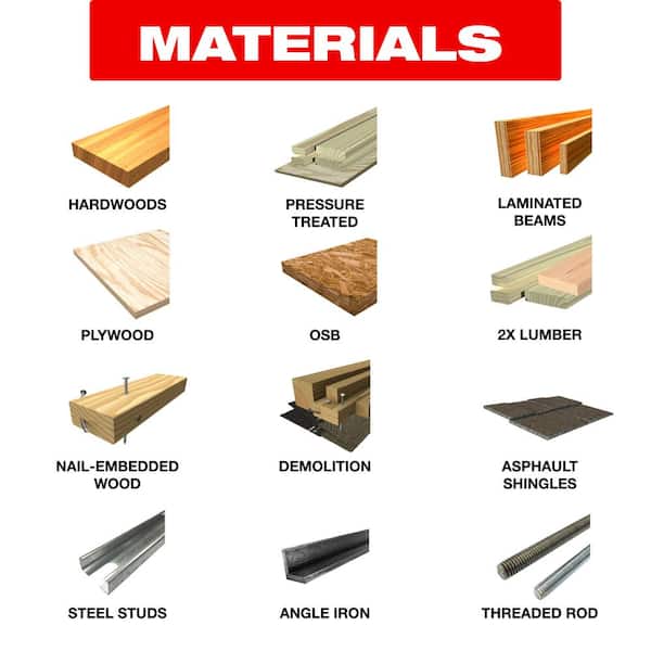 • Cuts 2x lumber, osb, steel studs, angle iron & threaded rod