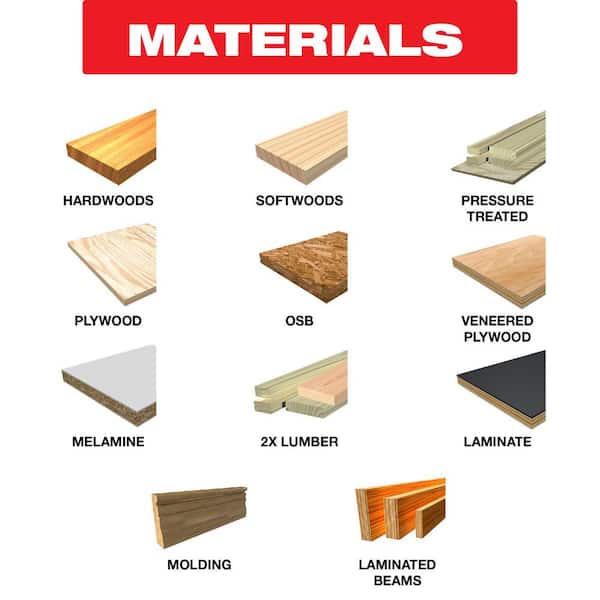 • Cuts hardwood, 2x lumber, pressure treated woods & composites
