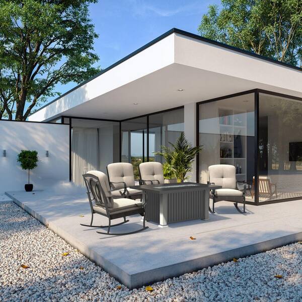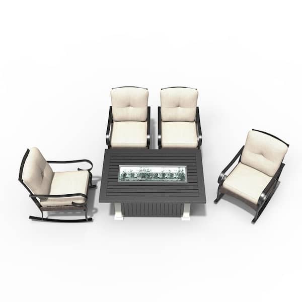 Beenle Gray 5-Piece Aluminum Rectangle Outdoor Gas Fire Pits Set with 4-Chairs and Beige Cushions