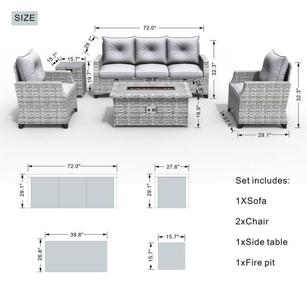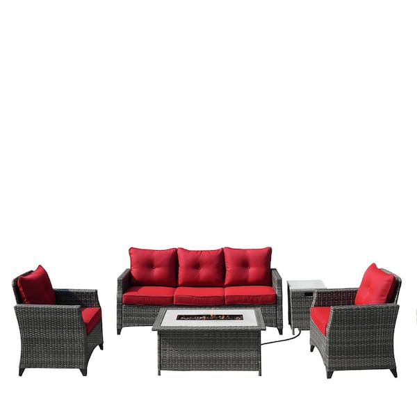 Emily 5-Piece Wicker Patio Gas Fire Pit Conversation Set with Red Cushions