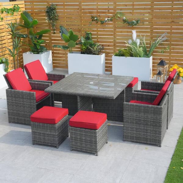 Industry Grey 9 of Piece Wicker Square Outdoor Dining Set with Red Cushions