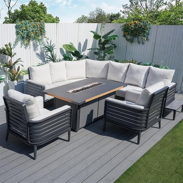 Inlay Dark Grey 7-Piece Aluminum Patio Conversation Set with Beige Cushions, a Fire Pit Table
