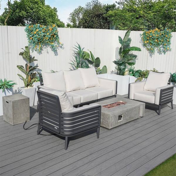 Inquirie 5-Piece Aluminum Patio Conversation Set with Beige Cushions, Grey Rectangle Concrete Fire Pit Table