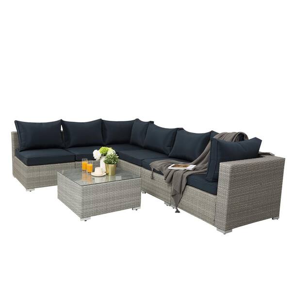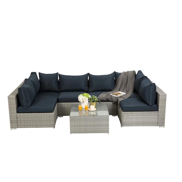 Lithium Gray 7-Piece Wicker Lithium Outdoor Garden Patio Furniture Sectional Sofa Sets with Dark Blue Cushions